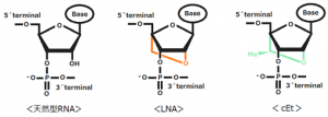 LNAは、RNAの2‘位の酸素原子と4’位の炭素原子をメチレンで架橋した架橋型人工核酸アナログの一つです。