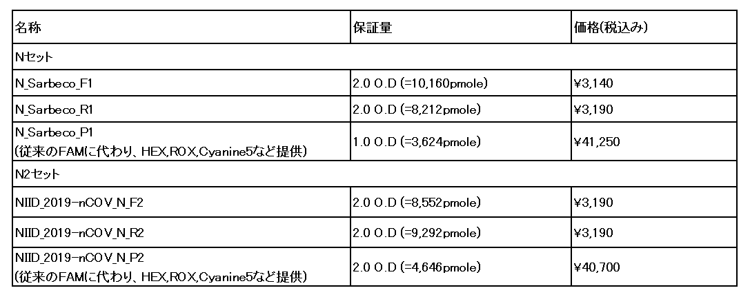 | 新型コロナウイルス検出用 N&N2プライマー・プローブセット合成 500反応/1セット \55,000(税込み価格) |