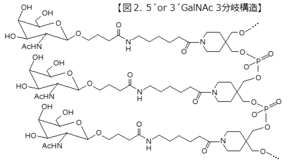 GalNAc1個修飾だけでなく、一般的によく用いられる『3個が連なった構造』の合成も可能です。その場合、一価の GalNAc をホスホジエステル結合で連なるように繋げた構造となります(図2)。