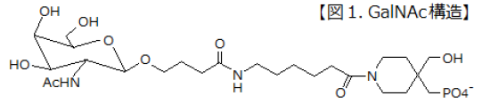 GalNAcは、アシアロ糖タンパク質受容体(ASGPR)と結合する単糖類です(図1)。そのため、GalNAc はASGPR を多く持つ肝細胞へ集積し、この受容体から肝細胞へ取り込まれます。GalNAc とオリゴヌクレオチドとのコンジュゲートを形成させることで、このコンジュゲートも肝細胞に高密度に存在する ASGPR に結合し、この受容体を介して肝細胞に取り込まれていきます。